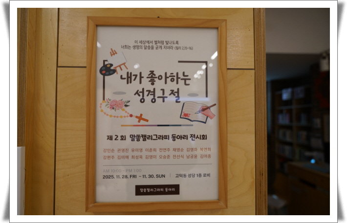 포토 내용 보기 제목 2025년 캘리그래피 작품 전시회 작성자 홍보분과 2025년 캘리그래피 작품 전시회(2025-11-28) 첨부파일 [꾸미기]KakaoTalk_20251129_154359582.jpg(크기 : 129.9 KBytes)downloads : 1